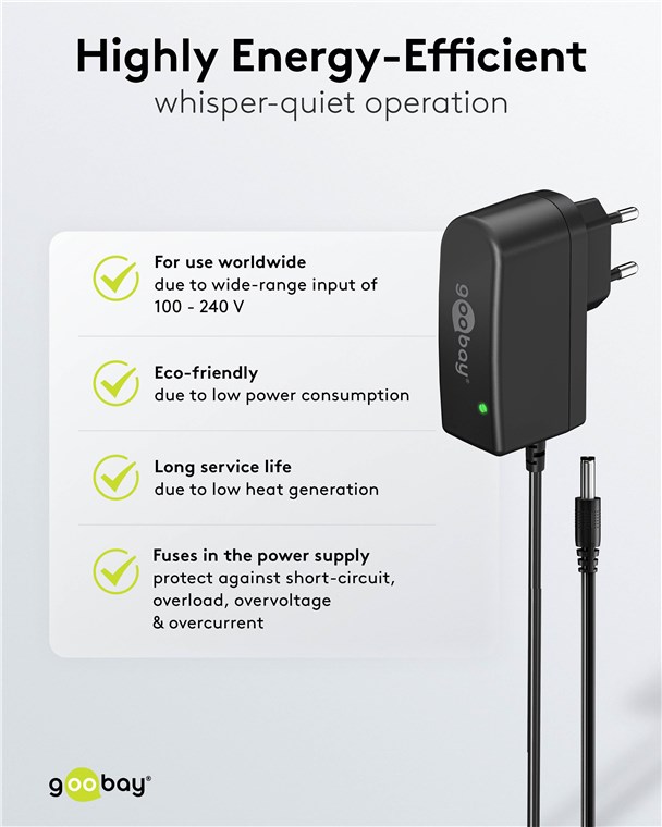Das 0,6-A-Netzteil ist die praktische Stromversorgung für viele Kleingeräte wie externe Festplatten, Scanner, Telefon, ISDN-Anlage oder Faxgerät. Durch den hohen Wirkungsgrad und den geringen Stand-by-Verbrauch werden Energieverbrauch und Wärmeentwicklung effektiv gesenkt und so gleichzeitig die CO2-Emissionen des Netzteils reduziert.
