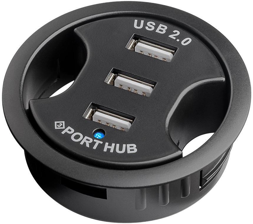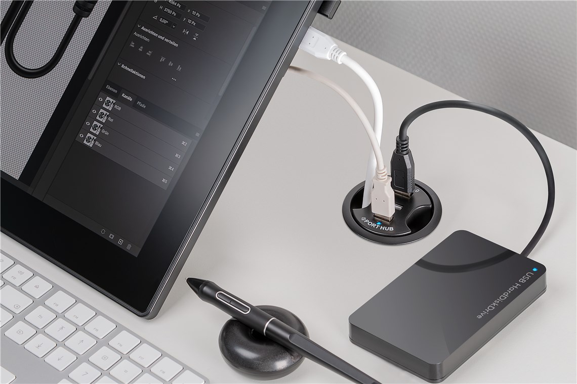 • Kompakter USB-Hub zum Einlassen in Tischplatten oder andere Oberflächen – für einen aufgeräumten Look ohne störende Steckdosenleisten oder klobige Hubs
