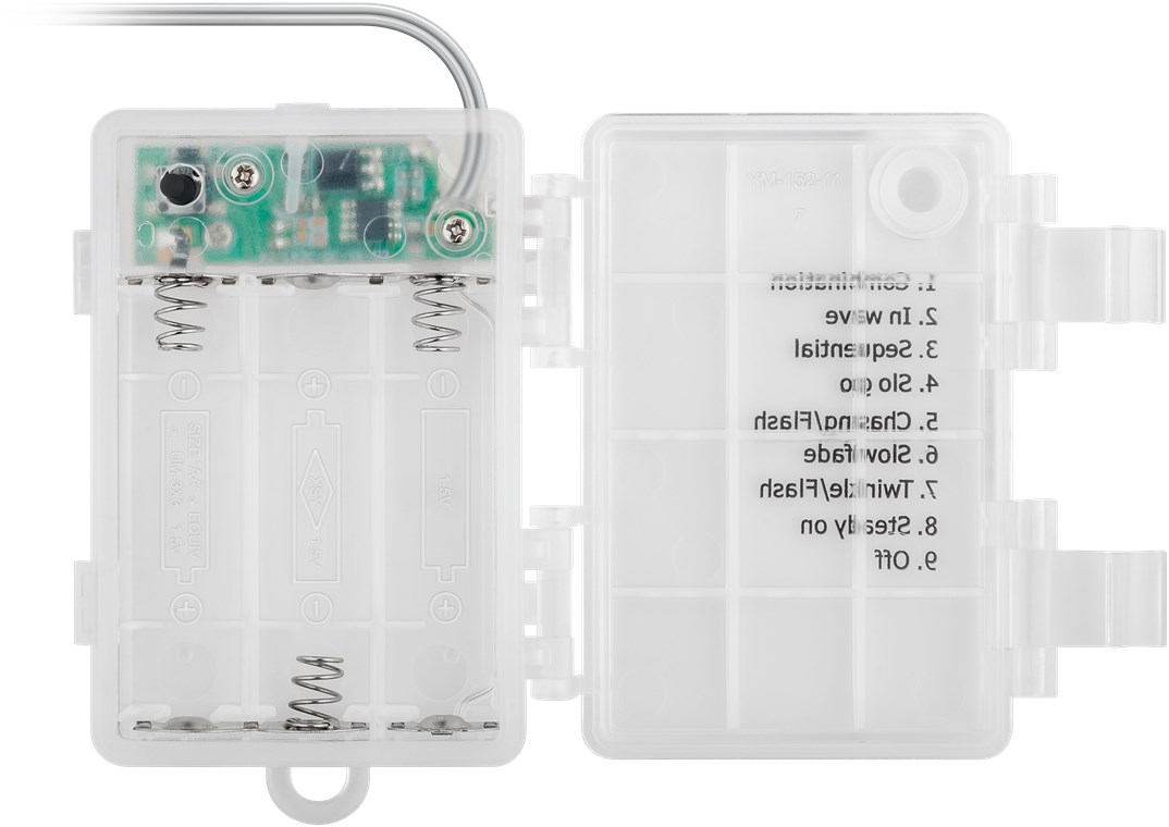 - 1 m USB-Kabel und Batteriebox mit 8 Modi (ein Schalter: Kombination, in Wellen, sequenziell, langsam glimmend, schneller Wechsel, langsames Dimmen, Funkeln, Dauerleuchten, aus)