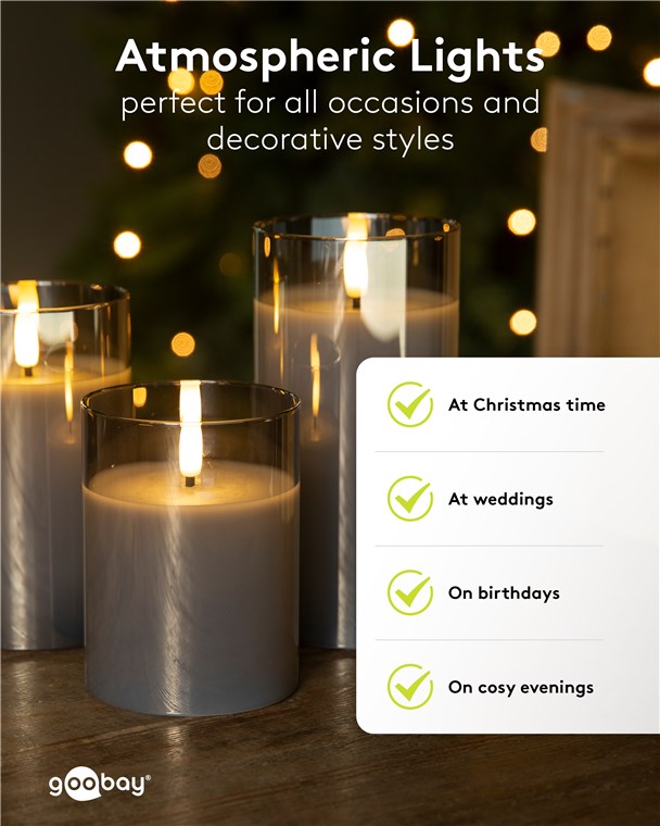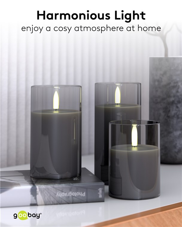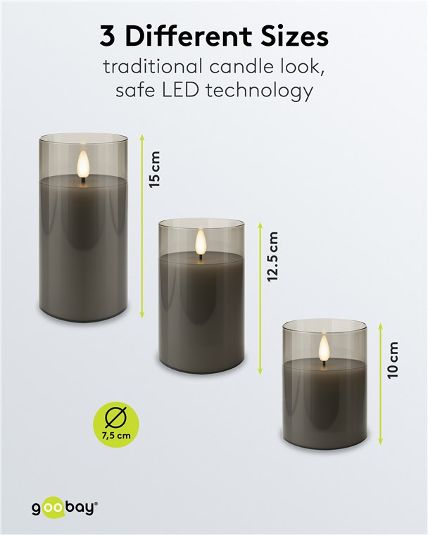 • Stilvolle Stumpenkerzen in drei verschiedenen Größen für warmen Kerzenschein mit natürlich wirkender, flackernder Flamme in einem grauen Glas – vollkommen elektrisch und vollkommen sicher