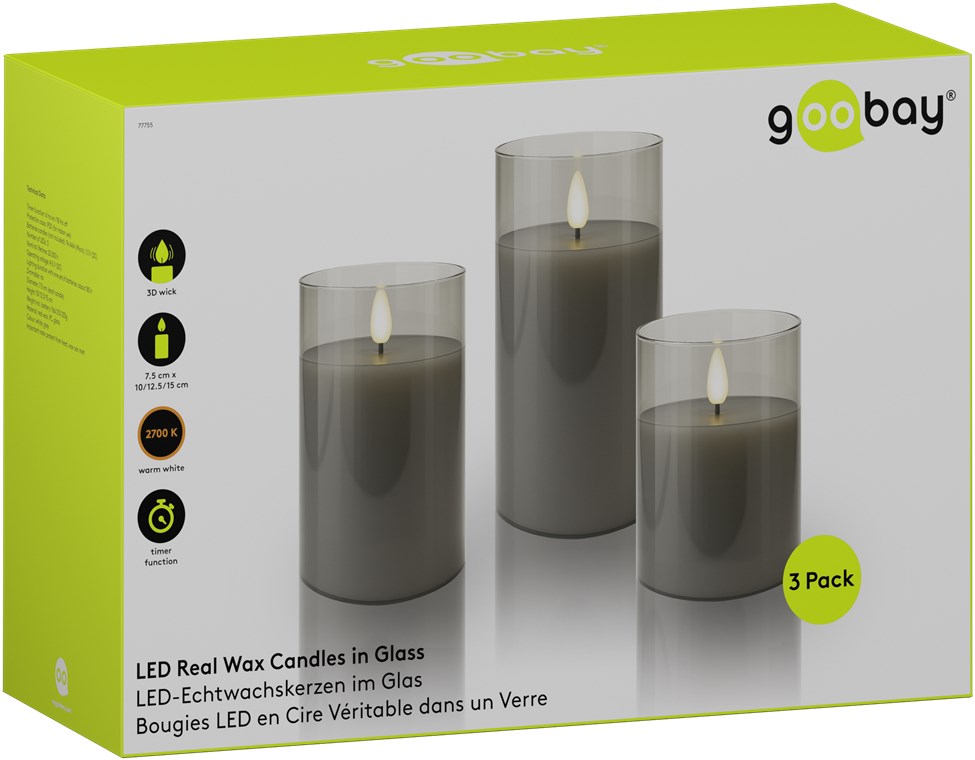 3er-Set LED-Echtwachs-Kerzen im Glas, grau-transparent