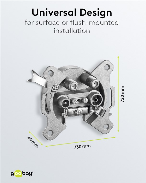 - Antennensteckdose zum Anschluss an Multischalter oder LNB, geeignet für Aufputz- und Unterputzmontage