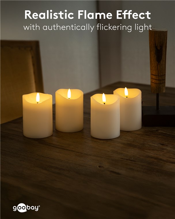 • Vier gleich große Stumpenkerzen mit 3D-Flammenkopf für warmen Kerzenschein mit natürlich wirkender, flackernder Flamme – vollkommen elektrisch und vollkommen sicher