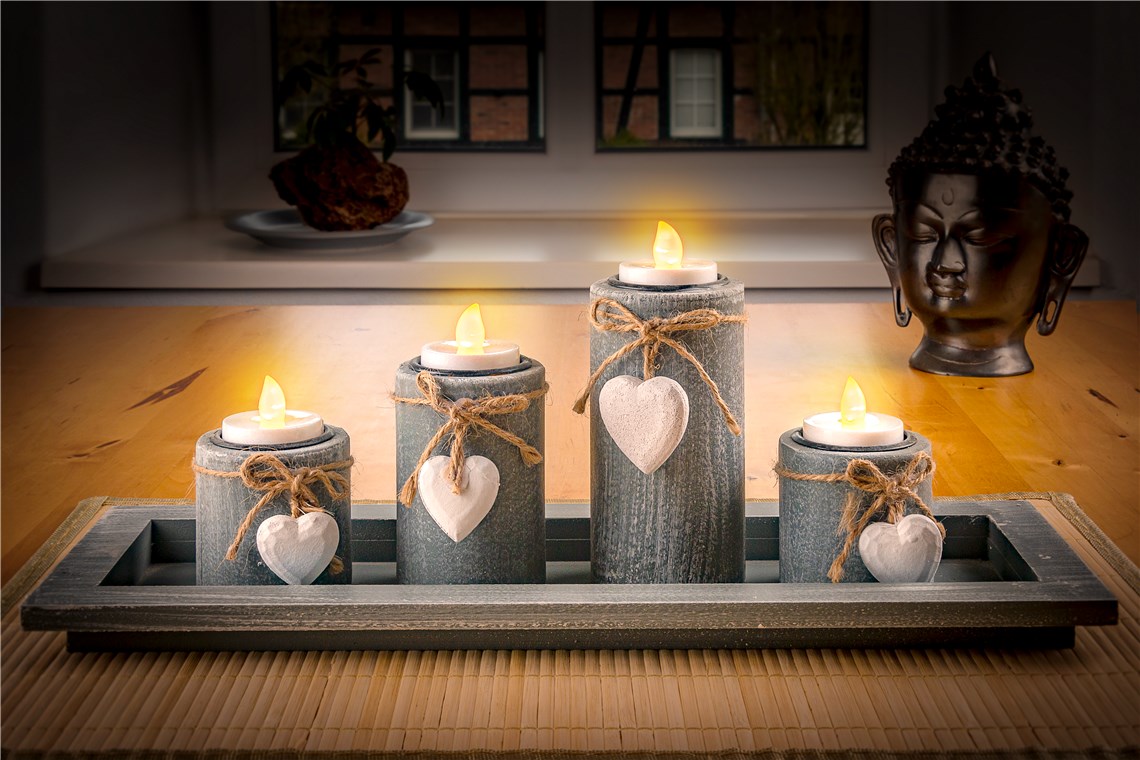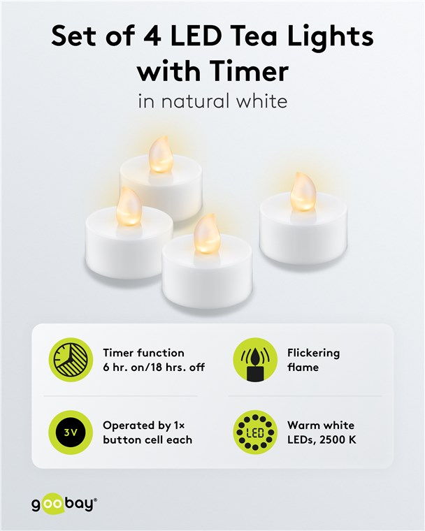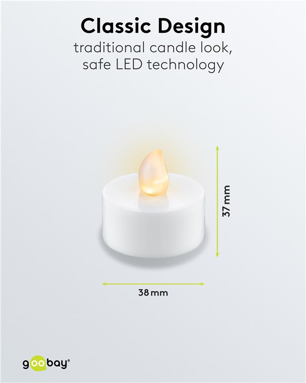- Klassische Teelichter für warmen Kerzenschein mit natürlich flackernder Flamme – vollkommen elektrisch und vollkommen sicher