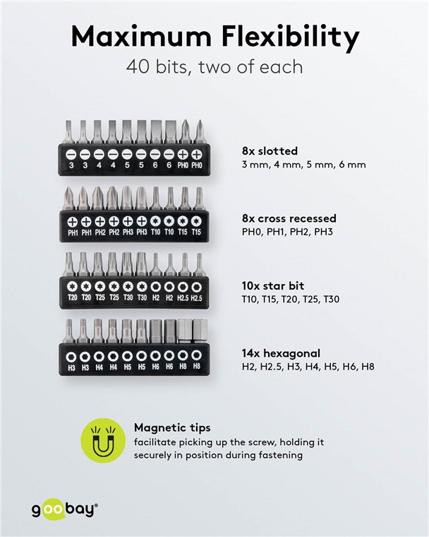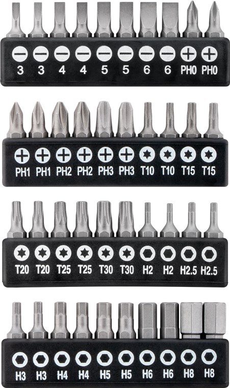 - Inkl. 40 Bits, jeweils in doppelter Ausführung: 8x Schlitz: 3 mm, 4 mm, 5 mm, 6 mm, 8x Kreuzschlitz: PH0, PH1, PH2, PH3, 10x Sechskant: T10, T15, T20, T25, T30, 14x Außensechskant: H2, H2.5, H3, H4, H5, H6, H8
