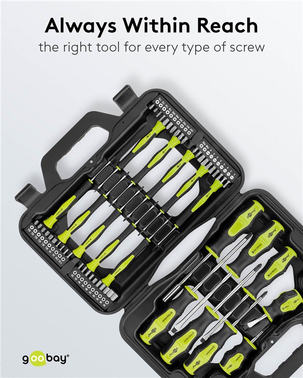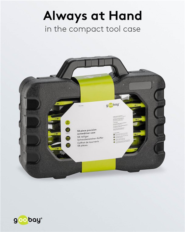 - Präzisionsschraubendreher aus Chrom-Vanadium-Stahl (Cr-V) für besondere Stoßfestigkeit, geliefert im kompakten Kunststoffkoffer