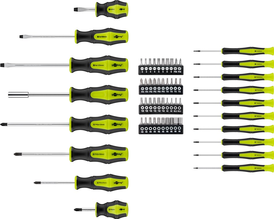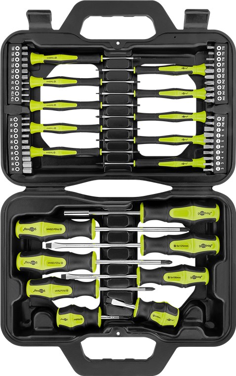 - 1x Bit-Halter, 3x Schlitzschrauber: 6 x 125 mm, 5 x 100 mm, 6 x 38 mm, 4x Kreuzschlitzschrauber: PH2 x 125 mm, PH2 x 100 mm, PH1 x 75 mm, PH2 x 38 mm
