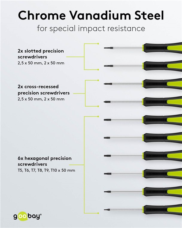 - 2x Präzisions-Schlitzschrauber: 2,5 x 50 mm, 2 x 50 mm, 2x Präzisions-Kreuzschlitzschrauber: 2,5 x 50 mm, 2 x 50 mm, 6x Präzisions-Sechskantschrauber: T5, T6, T7, T8, T9, T10 x 50 mm