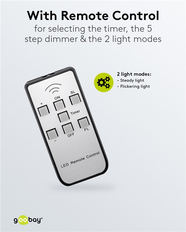 - Mit 7-Tasten-Fernbedienung zum Einstellen des Timers, des 5-Stufen-Dimmers und der 2 Leuchtmodi (dauerhaftes Leuchten, flackerndes Licht), inkl. CR2025 Knopfzelle