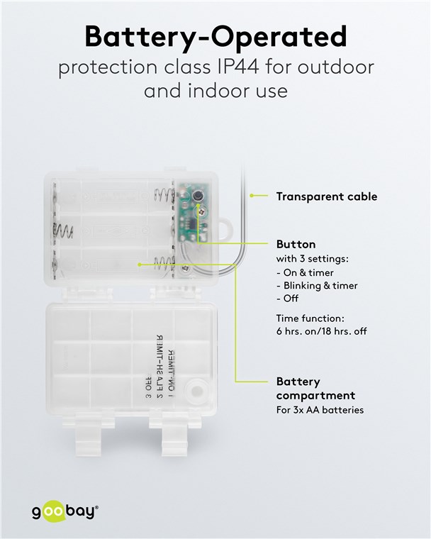 - Lichterkette mit Timer-Funktion: 6 Std. an/18 Std. aus, Schalter mit 3 Positionen: Dauerlicht/Timer, Blinken/Timer, aus