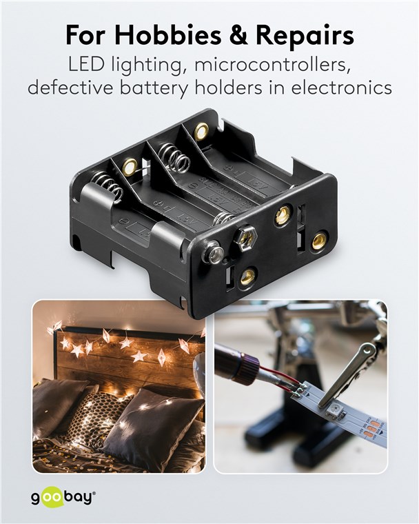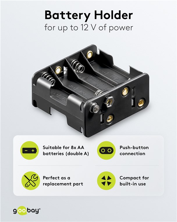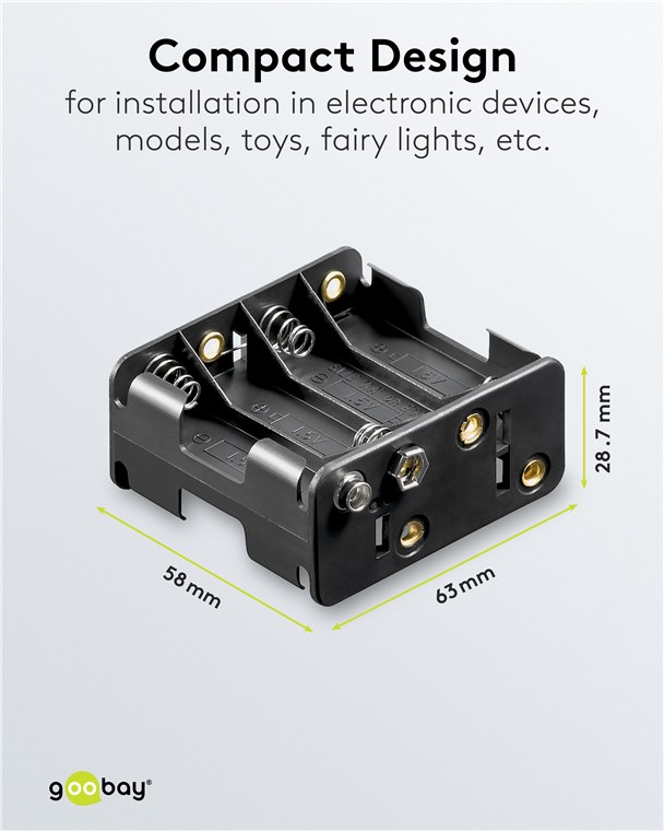 - Der Goobay-Batteriehalter kann in ein batteriebetriebenes Gerät eingebaut oder daran befestigt werden.