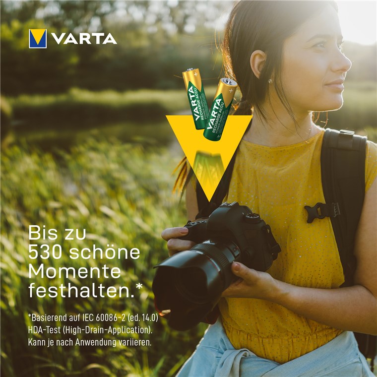 VARTA-Akkus gewährleisten eine zuverlässige Stromversorgung für elektronische Kleingeräte. Sie zeichnen sich nicht nur durch eine hohe Langlebigkeit, sondern auch durch eine ausgezeichnete Qualität aus. Herkömmliche Akkus entladen sich während der Lagerung und verlieren Kapazität. Die NiMH-Akkus mit "Ready to use"-Funktion weisen hingegen auch nach 12 Monaten Lagerung noch bis zu 75% ihrer Kapazität auf. Die Akkus können mit jedem Ladegerät aufgeladen werden.
