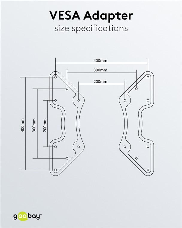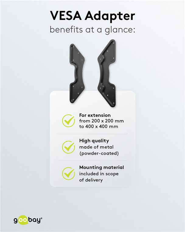 - Der Adapter erweitert oder verkleinert VESA-Lochabstände im Bereich 200x200 mm, 300x300 mm oder 400x400 mm