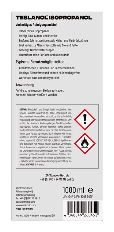 • Universalreiniger aus 99,5 % reinem Isopropanol zur Anwendung auf Arbeitsflächen, Fußböden und Fensterscheiben