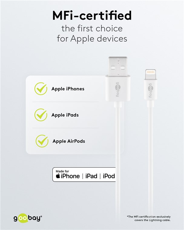 - Das Goobay-USB-Ladeset besteht aus 1x Ladegerät und 1,0 m langen Apple Lightning-Kabel.