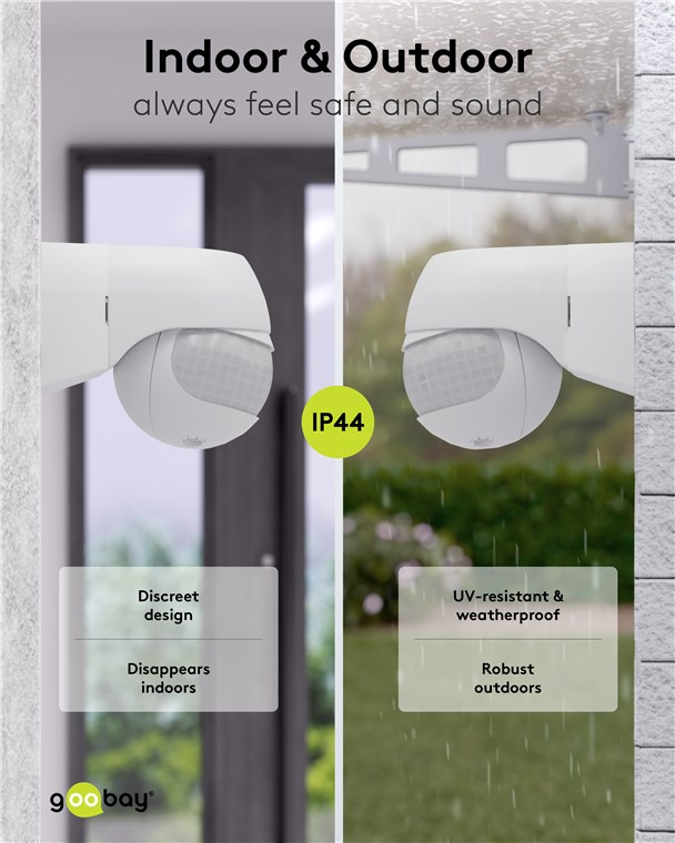 Wind und Wetter? Kein Problem, der Bewegungsmelder ist mit IP44 perfekt für Außenbereiche wie Garten, Carport oder Hauseingänge. Schließ ihn einfach an Weg- oder Außenbeleuchtung an, um Stolperfallen in der Dämmerung und im Dunkeln zu vermeiden. Bewegungsmelder von Goobay – mit Sicherheit ein gutes Gefühl.