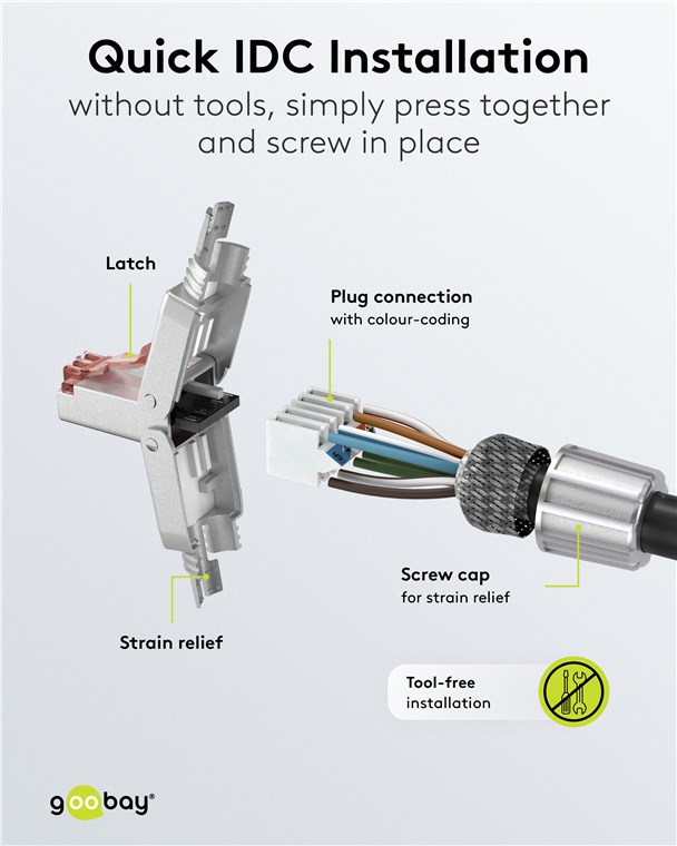 - Für eine schnelle, werkzeuglose Montage an Netzwerkkabeln durch einfaches Zusammendrücken des Steckergehäuses und Verschrauben der Zugentlastung