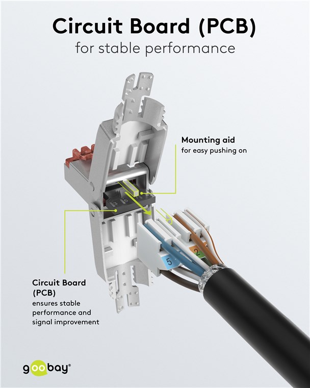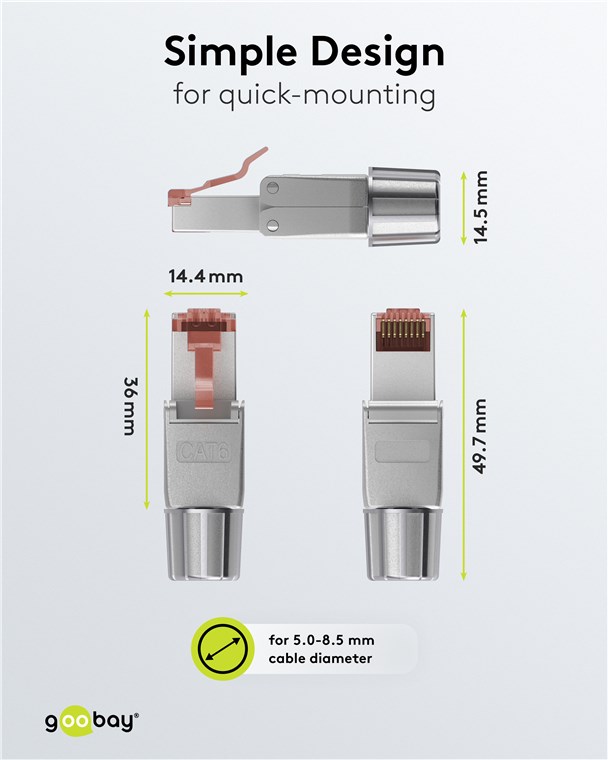 - Feldkonfektionierbarer Netzwerkstecker, geeignet für Rundkabel in den Ausführungen Massivleiter (AWG 22/1 - 26/1 solid) und Litzenleiter (AWG 22/7 - 26/7 stranded)