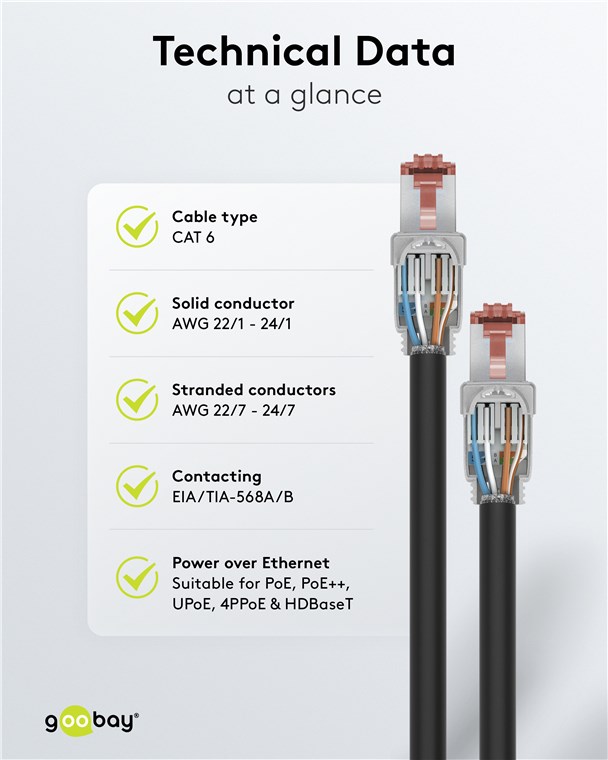 - Der CAT-6-Stecker unterstützt Power over Ethernet (PoE++, 4PPoE, Ultra PoE) gemäß IEEE802.3bt sowie 10GBase-T (abwärtskompatibel)
