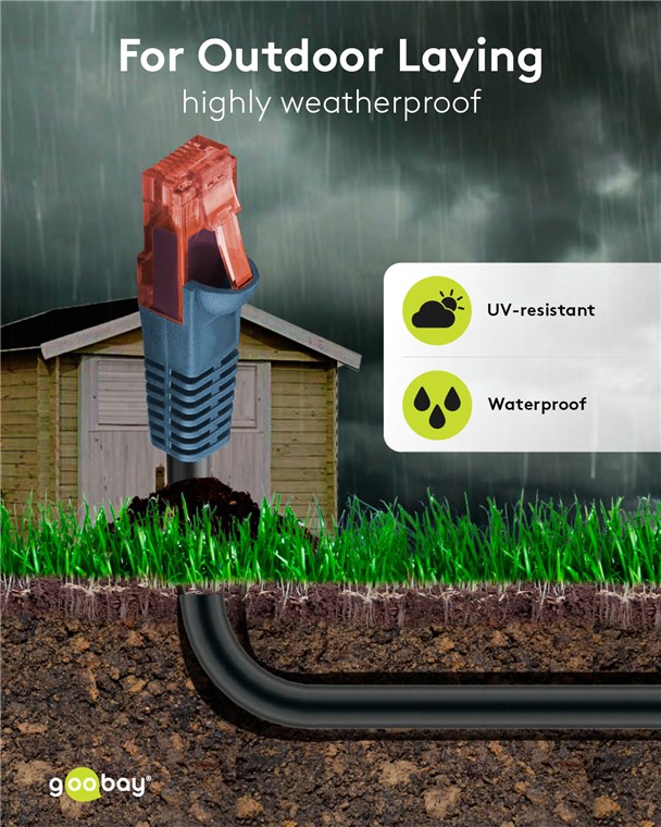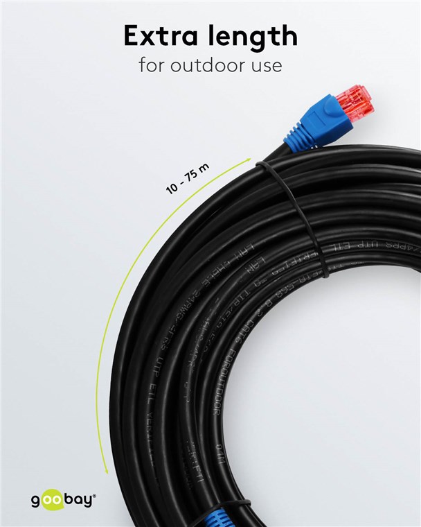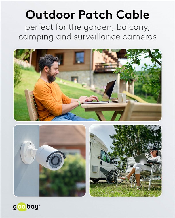 Das Goobay-Netzwerkkabel eignet sich ideal zur Verlegung im Außenbereich z. B. im Garten, beim Camping, an Gebäudefassaden, auf dem Balkon und zum Anschluss von Überwachungskameras. Der 2-fach geschützte Kabelmantel aus Polyethylen ist äußerst beständig gegenüber Witterungseinflüssen und UV-Strahlung.