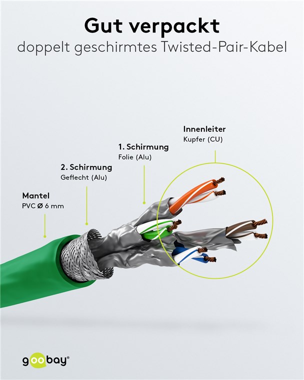 - Konfektioniertes, doppelt geschirmtes LAN-Kabel mit RJ45-Anschlüssen zur Verbindung von Netzwerk-Komponenten