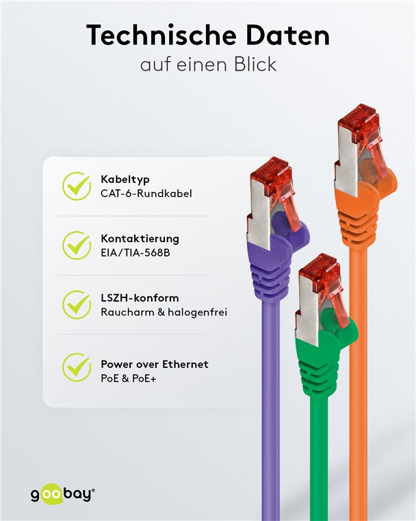 - Internetkabel ist CAT-6-getestet und für Power over Ethernet (PoE, PoE+) geeignet.