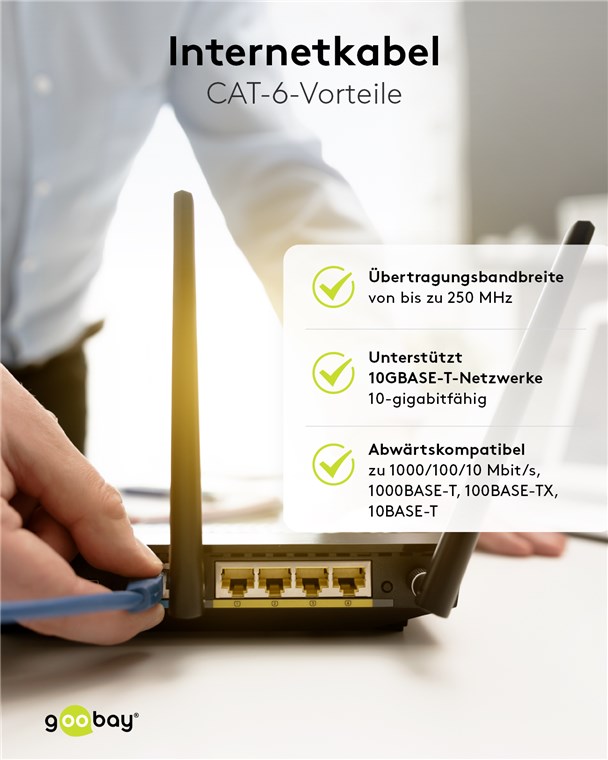 Das praktische Set Goobay CAT-Kabel in 10 verschiedenen Farben überträgt Signale in höchster Qualität bei extremer Geschwindigkeit und gewährleistet eine stabile Verbindung. Unsere Verbindungskabel und Stecker zeichnen sich durch hochwertige Innenleiter, robuste Kabelummantelung und passgenaue Stecker aus. Goobay bietet immer das passende Produkt für Ihre Netzwerkanwendung, egal ob für das Heim- oder das Firmennetzwerk. Einfach. Alles. Passend!