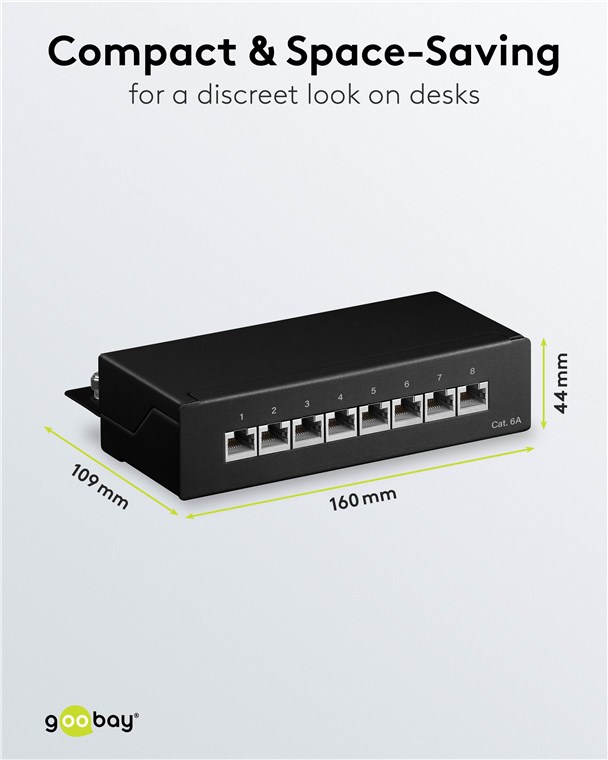 Unsere Patch-Panels besitzen ein robustes Metallgehäuse mit geschirmten Steckplätzen für eine ausgezeichnete Verbindung. Mit 8, 12 oder 24 Ports ausgestattet, können bequem alle benötigten LAN-Kabel an das Patchfeld angeschlossen werden. Goobay hat immer das richtige Produkt für Ihre Netzwerkverbindung. Einfach. Alles. Passend!