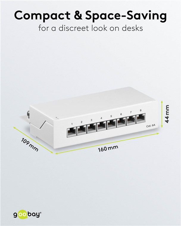 Unsere Patch-Panels besitzen ein robustes Metallgehäuse mit geschirmten Steckplätzen für eine ausgezeichnete Verbindung. Mit 8, 12 oder 24 Ports ausgestattet, können bequem alle benötigten LAN-Kabel an das Patchfeld angeschlossen werden. Goobay hat immer das richtige Produkt für Ihre Netzwerkverbindung. Einfach. Alles. Passend!