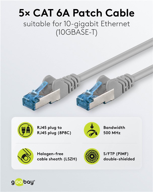 CAT 6A Patchkabel, S/FTP (PiMF), 1 m, grau, 5er-Set