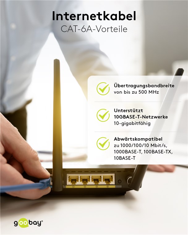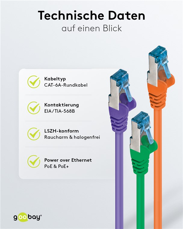 - Internetkabel ist CAT-6A-getestet (inkl. Messprotokoll) und für Power over Ethernet (PoE, PoE+) geeignet.