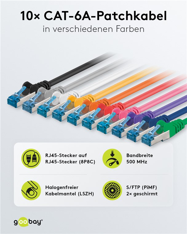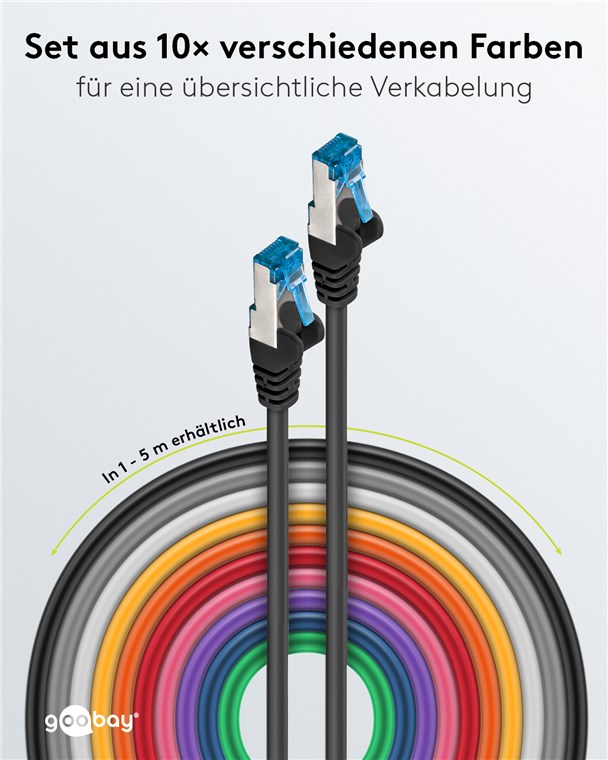 Das praktische Set Goobay CAT-Kabel in 10 verschiedenen Farben überträgt Signale in höchster Qualität bei extremer Geschwindigkeit und gewährleistet eine stabile Verbindung. Unsere Verbindungskabel und Stecker zeichnen sich durch hochwertige Innenleiter, robuste Kabelummantelung und passgenaue Stecker aus. Goobay bietet immer das passende Produkt für Ihre Netzwerkanwendung, egal ob für das Heim- oder das Firmennetzwerk. Einfach. Alles. Passend!