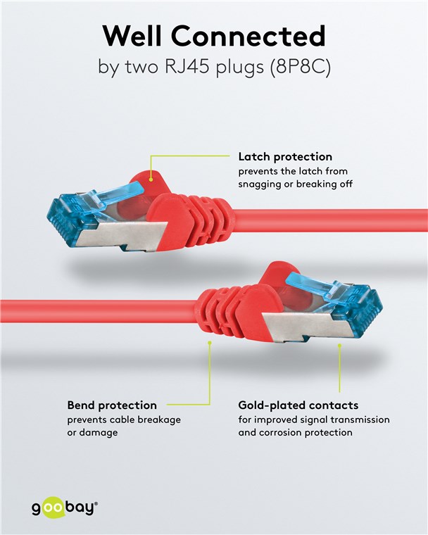 Unsere CAT-Kabel übertragen Signale in maximaler Qualität bei extremer Geschwindigkeit und sorgen für eine stabile Verbindung. Hochwertige Innenleiter, robuste Kabelummantelung und passgenaue Stecker zeichnen unsere Verbindungskabel und Stecker aus. Goobay hat immer das richtige Produkt für Ihre Netzwerkanwendung - sowohl für das Heim- als auch das Firmennetzwerk. Einfach. Alles. Passend!