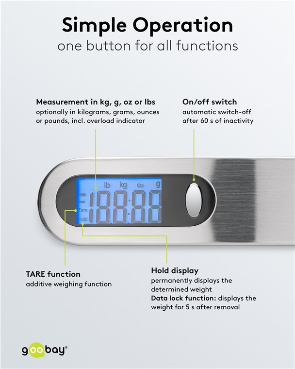 - Mit dem praktischen, beleuchteten LCD-Display ist die Hängewaage auch bei schlechten Lichtverhältnissen nutzbar