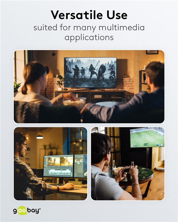 Die Goobay Plus Serie im schlanken, edlen Metalldesign in Sharkskin Grey. Mit dem DisplayPort™-1.4-Standard sorgt das Kabel für eine besonders hohe Bandbreite - für eine flüssige Bildwiedergabe ohne Bildschirm-Tearing oder Ruckeln beim Gaming und eine gestochen scharfe Auflösung mit bis zu 8K.