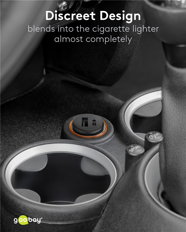 - Durch die kompakte Bauform und das dezente Design fügt sich der Kfz-USB-Adapter perfekt in die Mittelkonsole des Fahrzeugs ein.