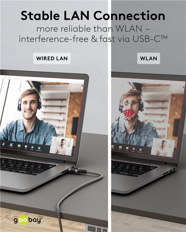 - Das LAN-Kabel ermöglicht eine stabile, kabelgebundene Internetverbindung an USB-C™-Geräten ohne separaten Netzwerkkabel-Anschluss