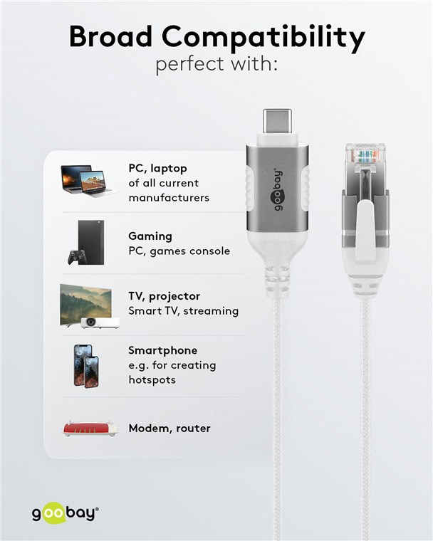 - Das LAN-Kabel ermöglicht eine stabile, kabelgebundene Internetverbindung an USB-C™-Geräten ohne separaten Netzwerkkabel-Anschluss