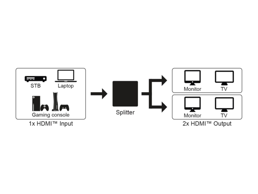- HDMI™-Splitter, der 1x HDMI™-Eingangssignal auf bis zu 2x HDMI™-Ausgänge wie TV-Gerät, Monitor oder Beamer dupliziert