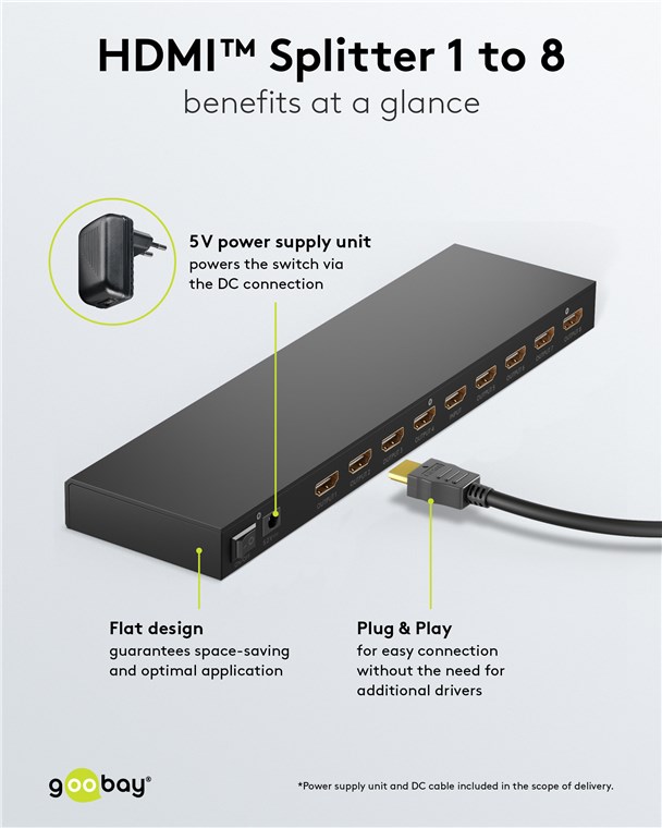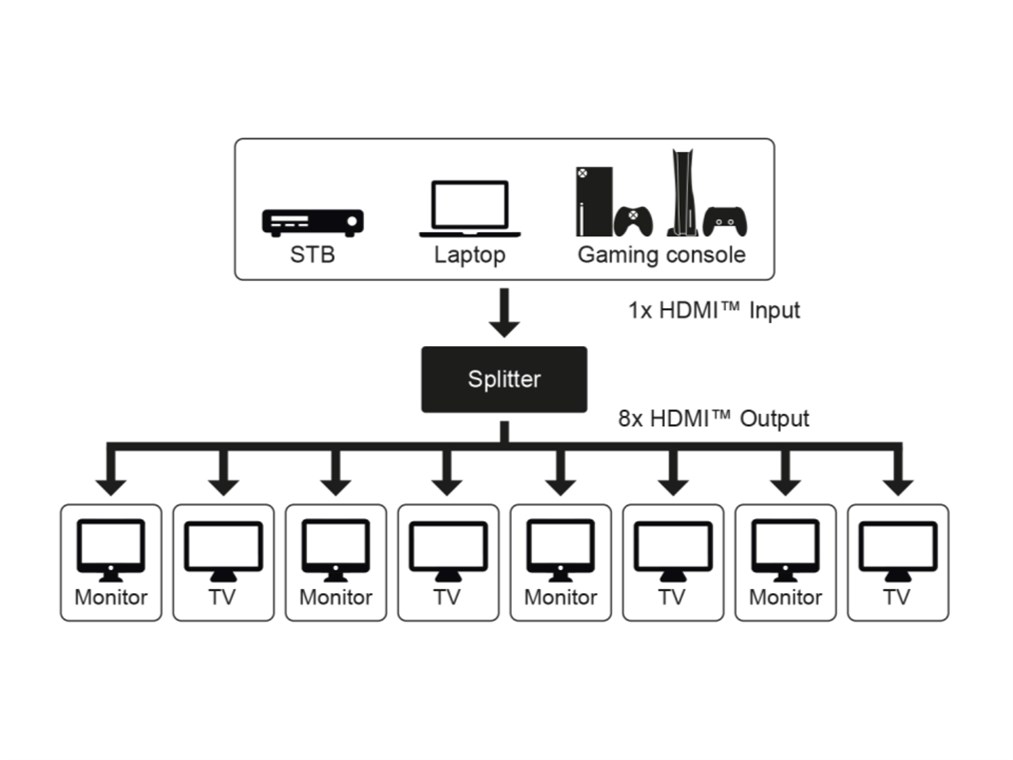 - HDMI™-Splitter, der 1x HDMI™-Eingangssignal auf bis zu 8x HDMI™-Ausgänge wie TV-Gerät, Monitor oder Beamer dupliziert