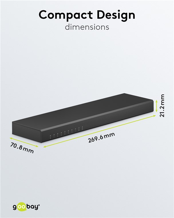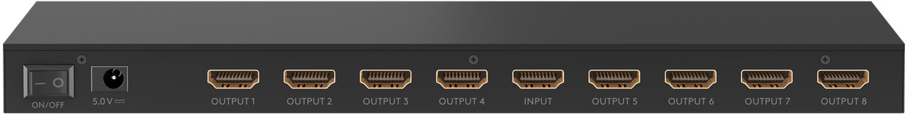 - HDMI™-Adapter 1 In 8 Out in flacher Bauform, ausgestattet mit wärmeableitendem Aluminiumgehäuse und vergoldeten Anschlüssen