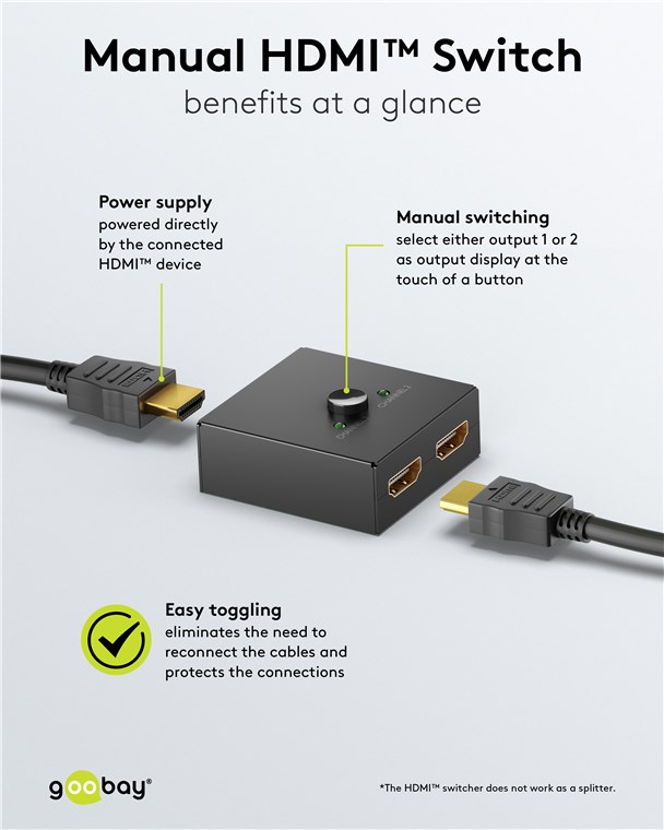 - Die HDMI™-Switchbox 2x1 wird ohne externe Stromversorgung direkt über das angeschlossene HDMI™-Gerät betrieben