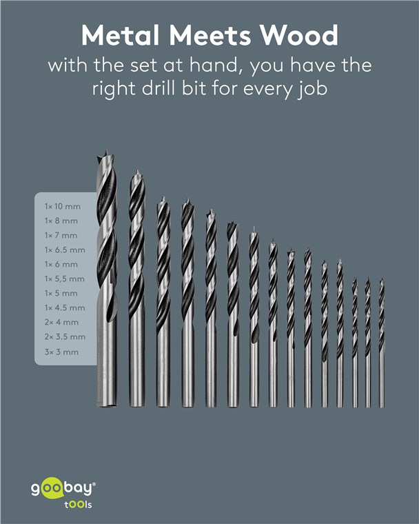 15 Holzbohrer (10 mm / 8 mm / 7 mm / 6,5 mm / 6 mm / 5,5 mm / 5 mm / 4,5 mm / 2x 4 mm / 2x 3,5 mm / 3x 3mm), Aufbewahrungsbox