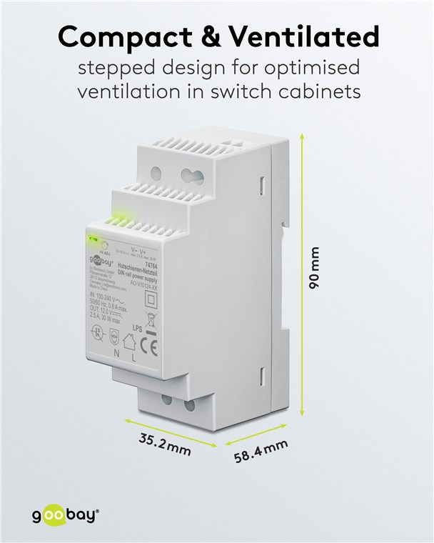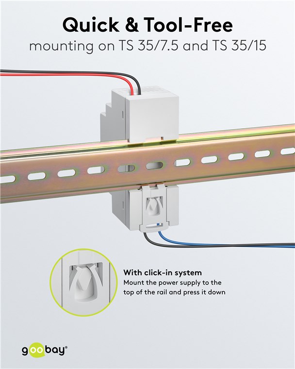 • Mit 35,2 mm Breite besonders kompakt und mittels Klicksystem schnell und einfach auf einer DIN-Schiene mit Hutprofil montierbar, z. B. im Schaltschrank