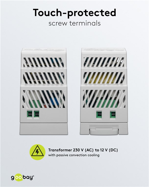• Der Trafo 230 V auf 12 V wird passiv über Konvektion gekühlt und über berührgeschützte Schraubklemmen angeschlossen