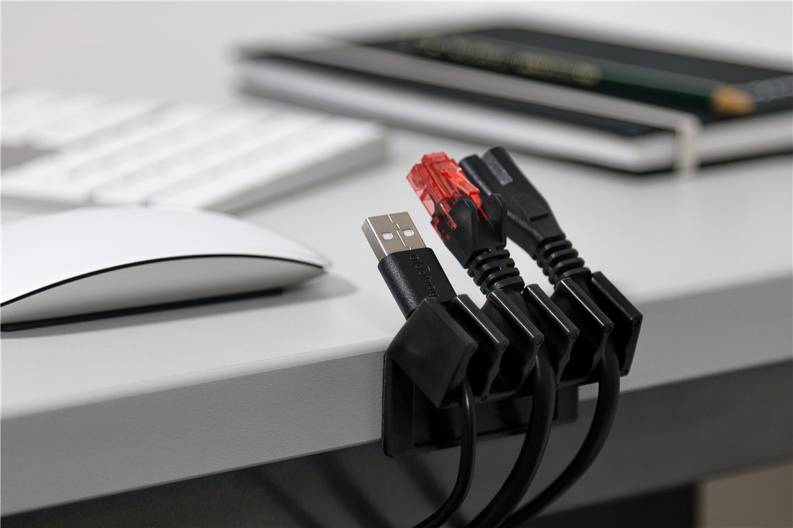 - Selbstklebende Kabelclips können direkt an der Schreibtischkante befestigt werden.