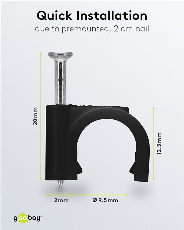 Hochwertiger stabilisierter PE-Kunststoff und verzinkte Stahlnägel. Sie können die Kabelklemmen mit Nagel im Innen- und Außenbereich verwenden und haben eine gute Isolierung, Korrosionsbeständigkeit und Alterungsbeständigkeit.