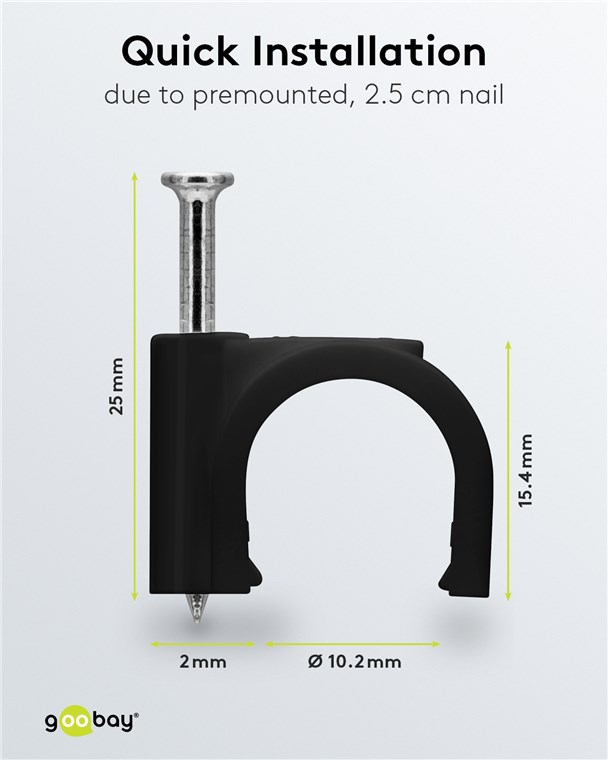 Hochwertiger stabilisierter PE-Kunststoff und verzinkte Stahlnägel. Sie können die Kabelklemmen mit Nagel im Innen- und Außenbereich verwenden und haben eine gute Isolierung, Korrosionsbeständigkeit und Alterungsbeständigkeit.