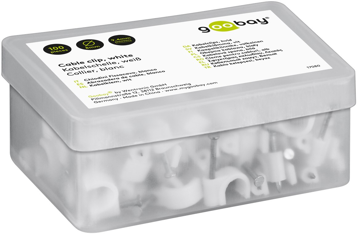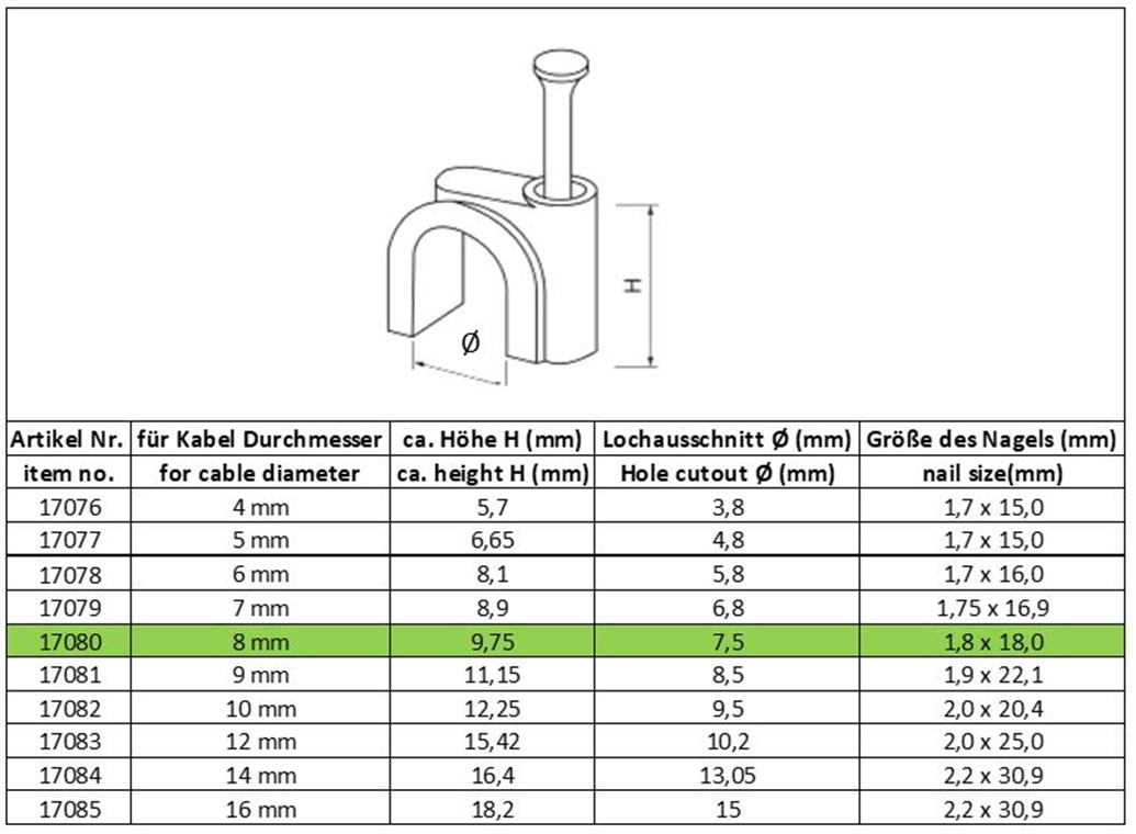 Hochwertiger stabilisierter PE-Kunststoff und verzinkte Stahlnägel. Sie können die Kabelklemmen mit Nagel im Innen- und Außenbereich verwenden und haben eine gute Isolierung, Korrosionsbeständigkeit und Alterungsbeständigkeit.