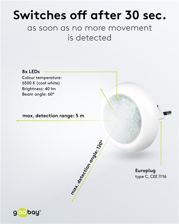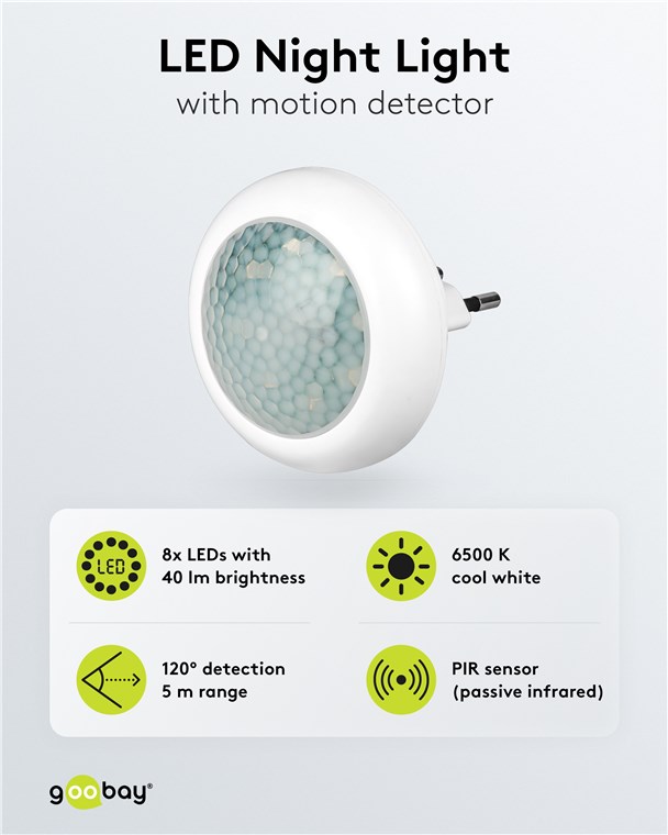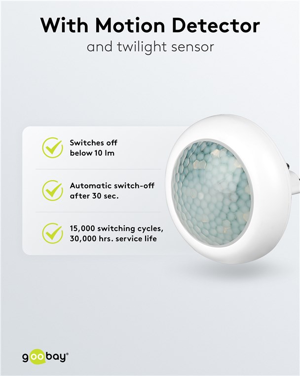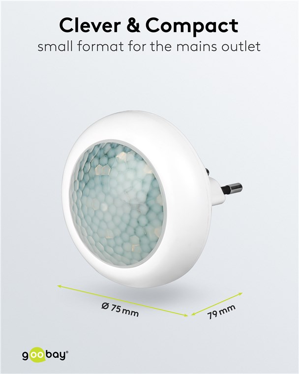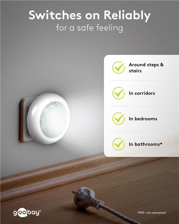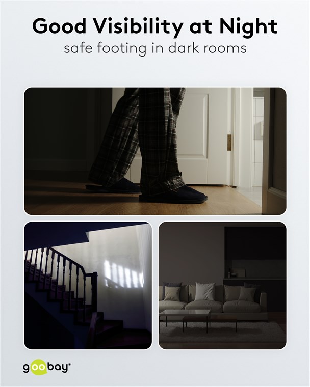 Mit Sicherheit ein gutes Gefühl: Das Nachtlicht mit Bewegungsmelder von Goobay verhindert zuverlässig Stolperfallen in der Dämmerung und im Dunkeln, z. B. beim Betreten der Wohnung oder beim Aufstehen in der Nacht. Für perfekten Komfort und sichere Orientierung.